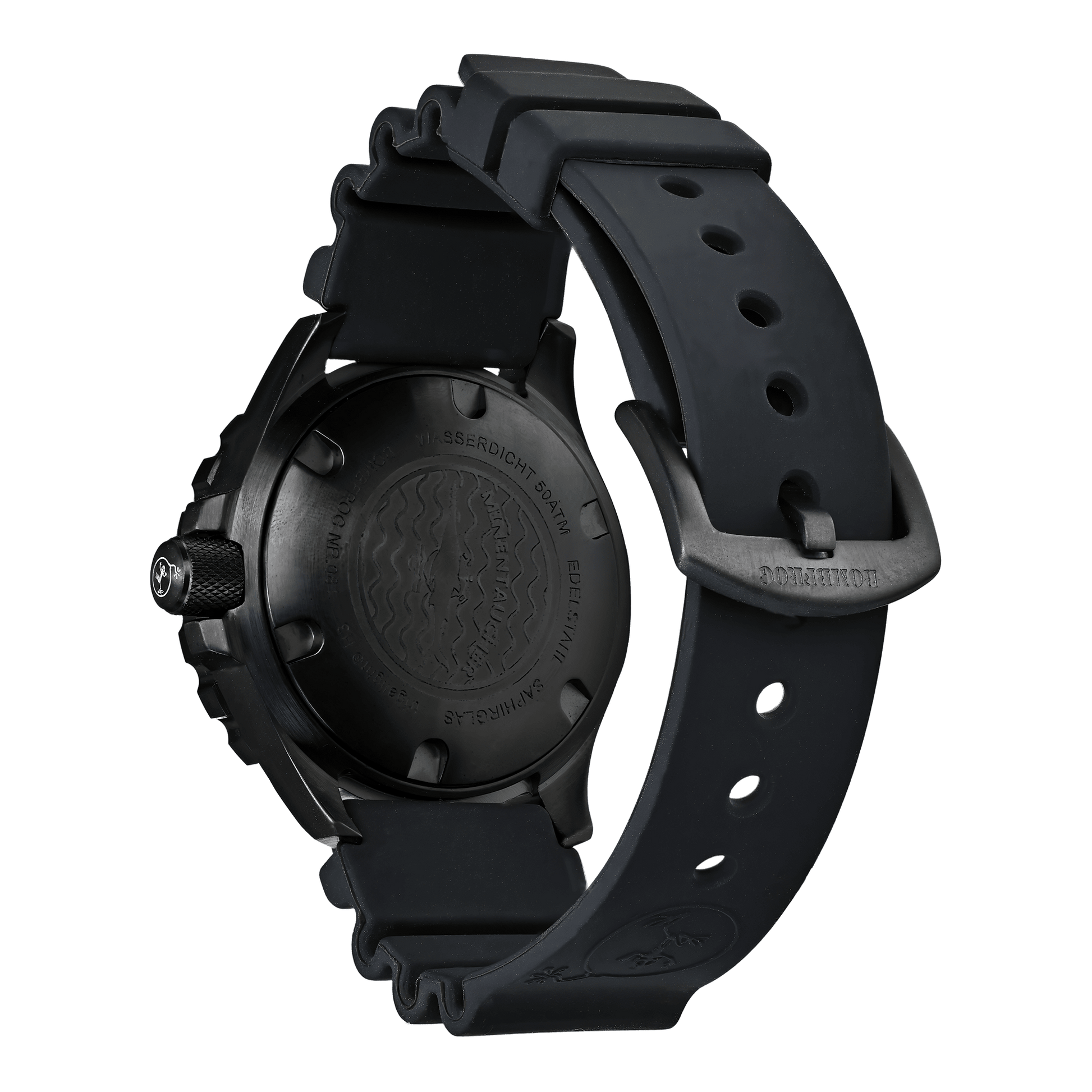 - Black case made of 316L stainless steel