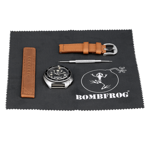 Damit die hochwertigen Uhren von BOMBFROG® auch jede Reise unbeschadet überstehen, wird das praktische Travelcase von BOMBFROG® angeboten, das verlässlichen Schutz bietet. Durch ein in der Box fixiertes Gummiband wird die Uhr stets an ihrem vorgesehenen Platz gehalten. Darüber hinaus ist ein Inlay in der Box enthalten, in welches eine Garantiekarte oder ein kleines Handbuch passt.